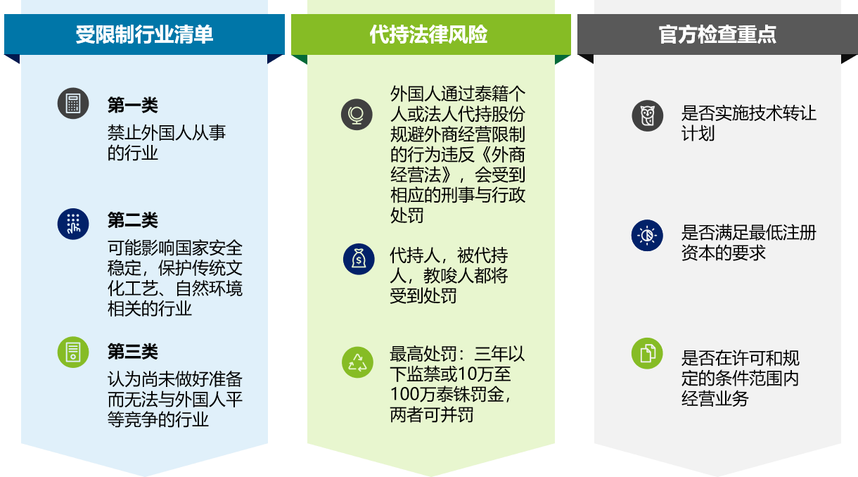 風險提醒:任何外商試圖通過以泰籍個人或法人代持股份之行為繞過投資限制,一旦被發現,將面臨三年以下有期徒刑或 10 萬–100 萬泰銖罰金,甚至雙重處罰。