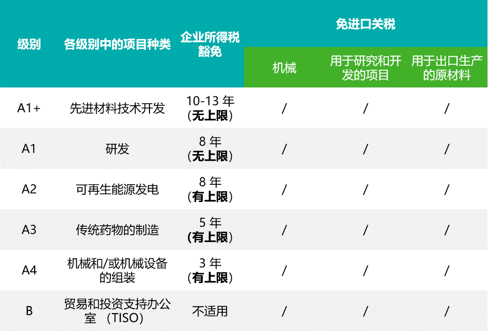 企業所得稅免稅期間最長可達 13 年,如 A1+ 類別的先進材料技術開發項目,免稅期豐厚且無上限;而 A1 類別的研發項目同樣享有 8 年免稅期,無上限。不過,部分優惠是有條件限制的,如 A2 類別的可再生能源發電項目和 A3 類別的傳統藥物製造項目,它們的免稅期分別為 8 年和 5 年,且有上限規定。 A4 類別的機械和 / 或機械設備組裝項目,免稅期為 3 年,也有上限。