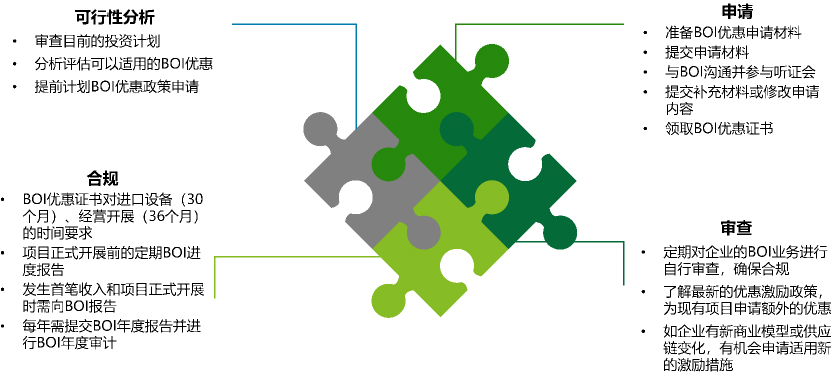 - 把握 BOI 稅假期、機械 0 % 進口稅等政策紅利,盡早創造價值