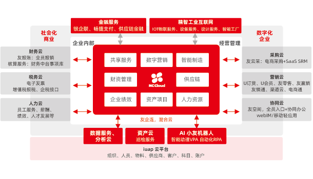 NC Cloud大型企業數位化平台,深度應用新一代數位技術,打造開放、 互聯、融合、智能的一體化雲平台,聚焦數位化管理、數位化經營、數位化商業等三大企業數位化轉型戰略方向,提供涵蓋數位營銷、智能製造、財務共享、人力共享與協同,智慧採購、數據中台等18大解決方案,幫助大型企業全面落地數位化。